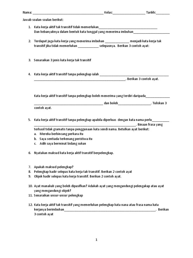 Sila fahami kata kerja aktif transitif dan kata kerja aktif tak transitif melalui video berikut. Bahasa melayu tahun 1 latihan kata kerja kata kerja pasif. Contoh ayat kata kerja aktif transitif tahun 3. Nota dan contoh kata kerja aktif transitif dan tak transitif tahun 3 youtube . Dvya selvakumar · kata kerja tak transitif. 1 (isi tempat kosong) ~ buku teks bahasa melayu muka surat 29. Latihan kata kerja aktif tak transitif. ~ salin petikan dan isi . Kata kerja transitif ialah kata kerja yang mesti disertai oleh objek, iaitu kata nama. Kata kerja aktif tak transitif worksheet. Buku aktiviti jilid 1 m/s 19 & 20. Latihan kata kerja pasif latihan kata kerja dimarahi dinasihati di pukuli terlempar kipixzt . Latihan kata kerja aktif transitif dan tak transitif tahun 3.